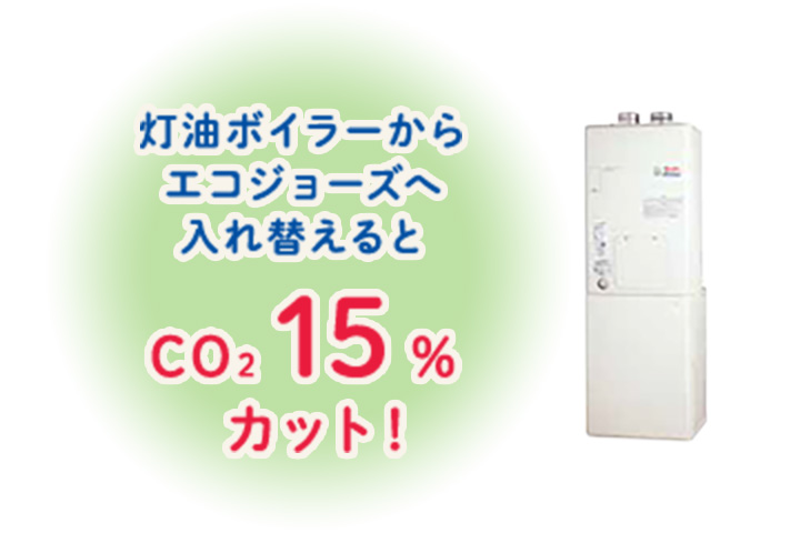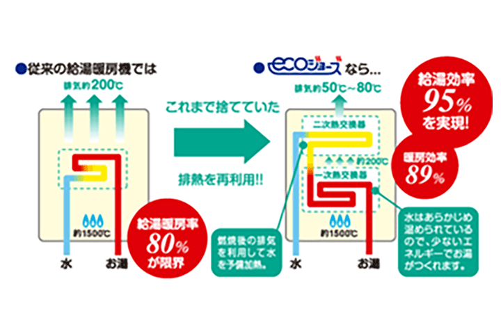 エコジョーズは今までのボイラーに比べ、熱効率が大幅アップした省エネルギーガスボイラーです。
