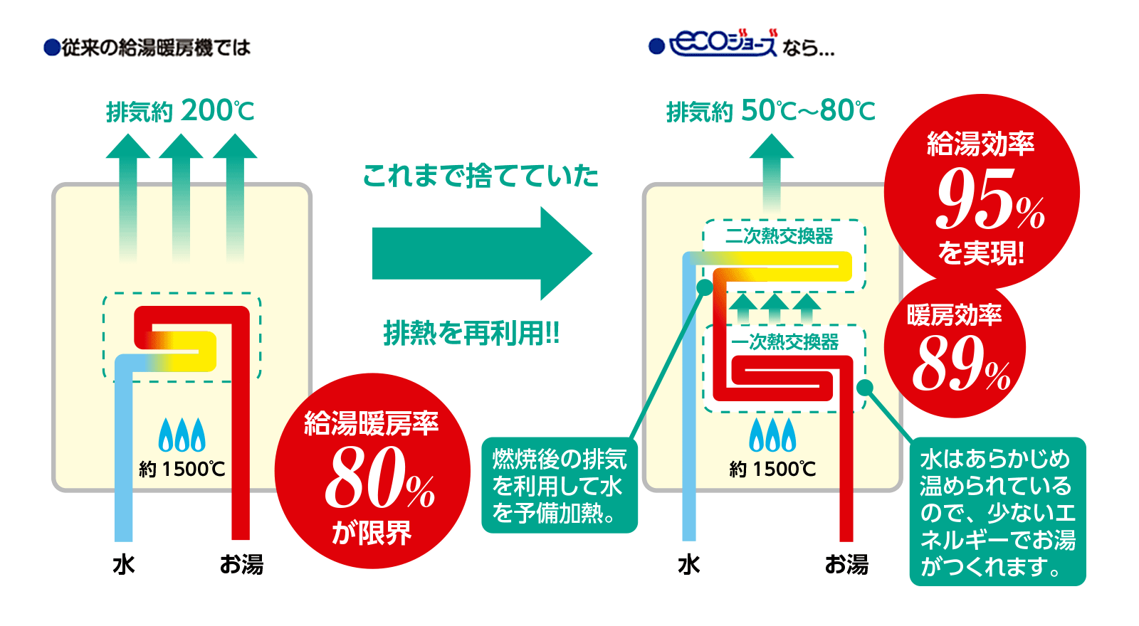 これまでの給湯器の熱効率は80%が限界。 エコジョーズは今まで捨てていた排熱を再利用することで、95%の熱効率を実現しました。